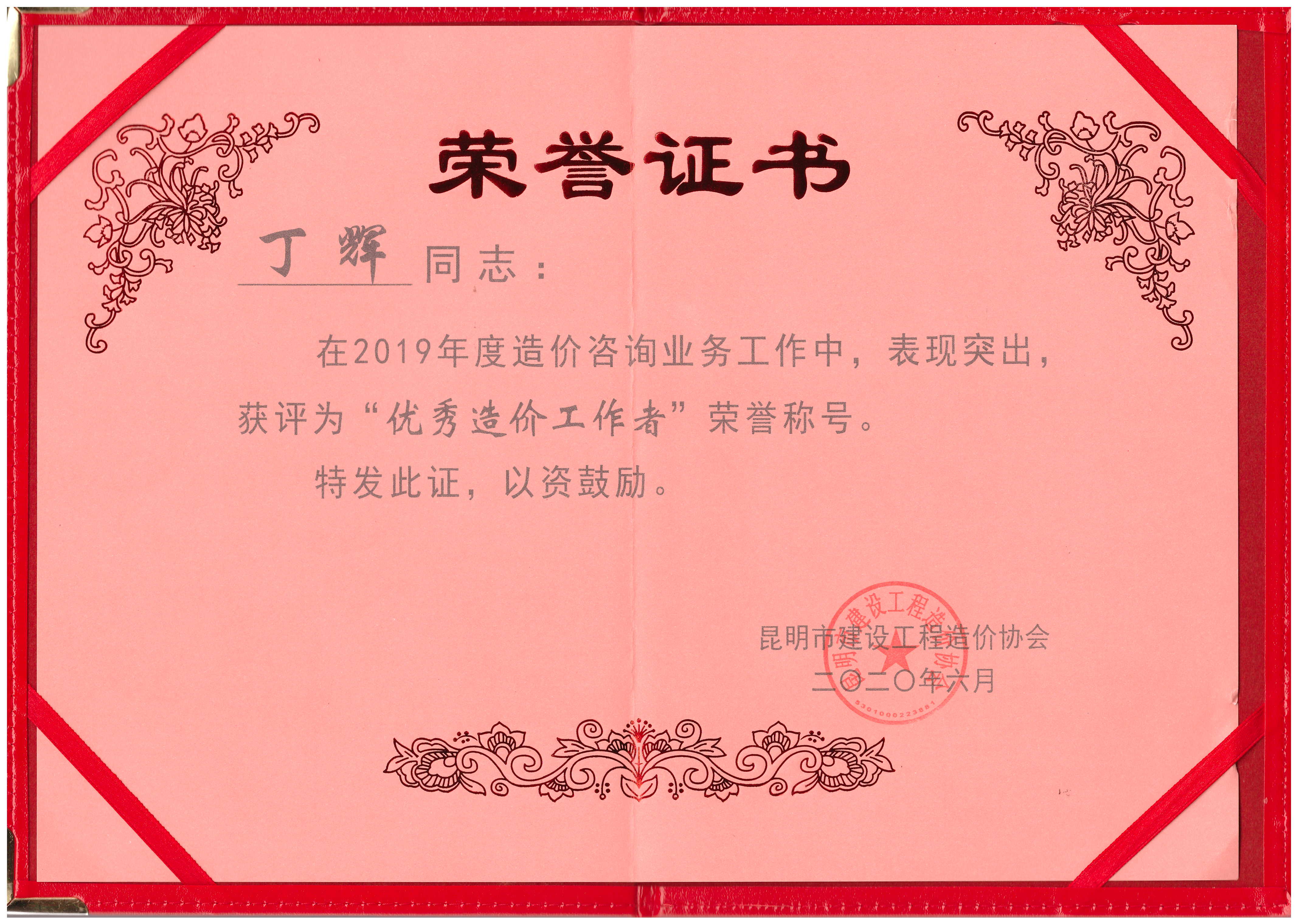 祝賀丁輝、李春宇同志榮獲2019年度“優秀造價工作者”
