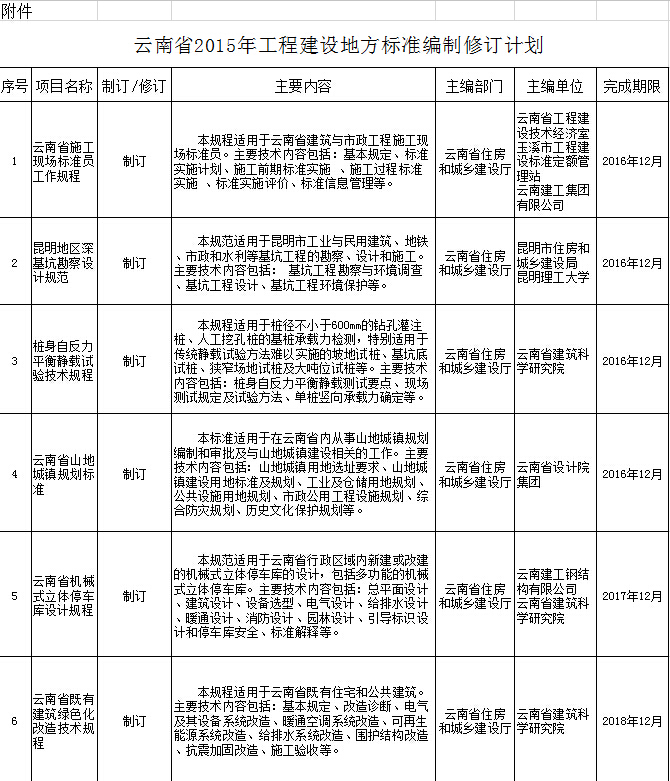 附件:《2015年云南省工程建設地方標準編制修訂計劃》